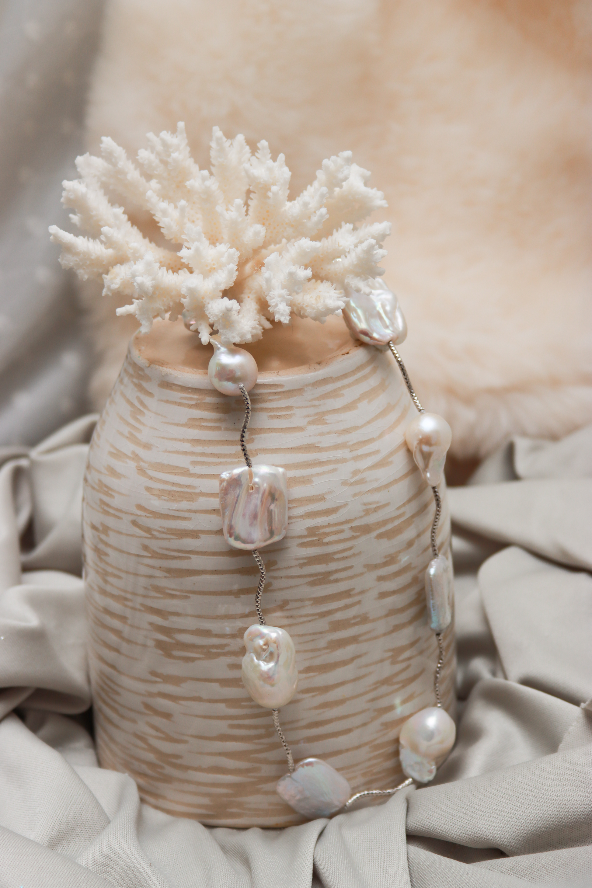 Elevate your style with this timeless freshwater pearl necklace, handcrafted with care and elegance. Each pearl is uniquely shaped, showcasing its natural beauty and soft iridescence. These pearls celebrate authenticity and individuality, making every necklace one of a kind.